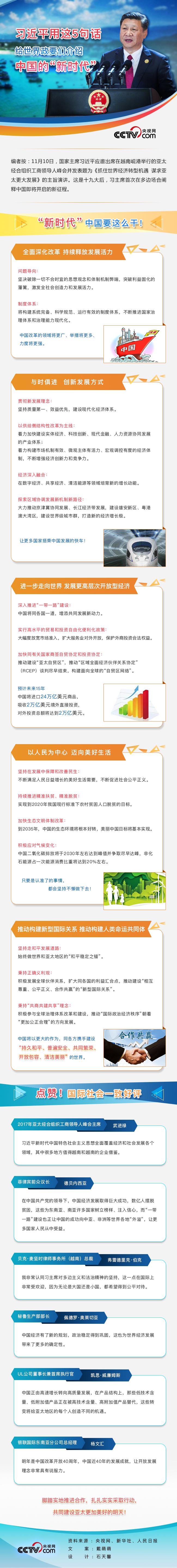 11月10日,國家主席習(xí)近平應(yīng)邀出席在越南峴港舉行的亞太經(jīng)合組織工商領(lǐng)導(dǎo)人峰會并發(fā)表題為《抓住世界經(jīng)濟(jì)轉(zhuǎn)型機遇 謀求亞太更大發(fā)展》的主旨演講。這是十九大后,習(xí)主席首次在多邊場合闡釋中國即將開啟的新征程。