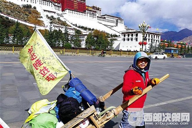 “從陜西到拉薩,3300多公里,路途遙遠(yuǎn),光車(chē)子輪胎我就換了3條,還磨壞了3根車(chē)軸,但是我堅(jiān)持了下來(lái),終于到了拉薩,到了終點(diǎn),我成功了。”