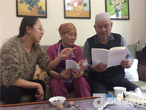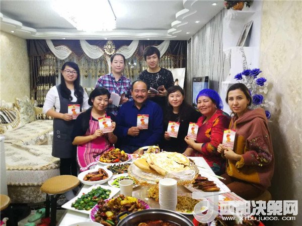 傍晚,一大群來自不同民族,不同單位的新疆兒女聚在了一起,紛紛加入到這個(gè)民族團(tuán)結(jié)的大聚會(huì)里,彈一首歡快悅耳的冬不拉,舞一曲深情優(yōu)美的賽乃姆,唱一首民族團(tuán)結(jié)的贊歌,將整個(gè)聚會(huì)推向高潮。賽買提·阿合買提高興地說:“我今天太開心了!這個(gè)結(jié)婚紀(jì)念日太有意義了,你的親戚,我的親戚,變成了我們的親戚,以后這就是你們的家,你們要經(jīng)常來??!” 趁著大家都在興頭上,韓莉書記又拿出學(xué)校專門印制的《不忘初心 牢記使命-黨的十九大精神進(jìn)校園讀本》,熱情地為親戚們宣傳起十九大精神,給大家講起黨的好政策來。在得知艾來提·賽買提目前還沒有找到合適的工作,沒有穩(wěn)定收入的情況后,大家立刻表示愿意幫助他早日找到合適的工作,幫助他們解決最實(shí)際的困難,把溫暖送到他們的心坎中。大家唱唱跳跳,說說笑笑,其樂融融,在互幫互助中讓民族團(tuán)結(jié)之花越開越艷。
