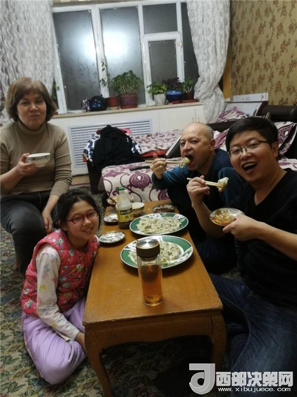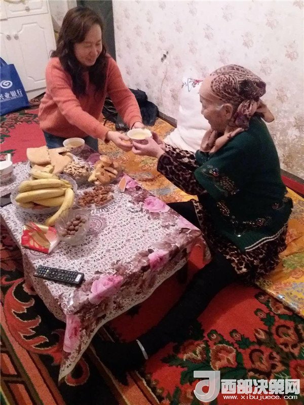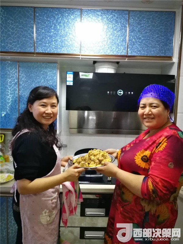 艾來提·賽買提的父親賽買提·阿合買提一面接過韓莉書記手里的米、面、清油和兩大兜食材,一面心疼地埋怨:“這么冷的天,你們又拿這么多東西,多辛苦,你上次送來的東西還沒有吃完呢。”韓莉和王艷萍笑而不語,心里默默地盤算著帶給親戚意外的驚喜。因?yàn)榘瑏硖?middot;賽買提和愛人長期兩地分居,聚少離多。今天正好是他們父母結(jié)婚三十周年紀(jì)念日,她們?nèi)嗽缇蜕塘亢靡欢ㄒH手做一頓飯,邀請(qǐng)這個(gè)民族團(tuán)結(jié)大院里附近的同事和各自的親戚一起來給這個(gè)小家庭舉辦一場別開生面的大融合聚會(huì),她們忙碌著,擇、洗、炒,撲鼻的香味彌漫在親戚的家中……