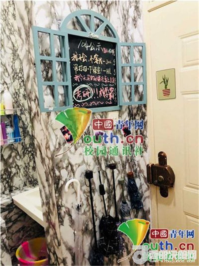 記者了解到,華麗變身后的宿舍,除了效果讓人驚艷不已外,還有許多小細(xì)節(jié)同樣讓人覺得很暖心。在門口處有一個小黑板,上面寫著室友的留言和一些鼓勵的話語;進(jìn)門的地方專門騰出一塊空間,放雨傘、鑰匙等一些物品。