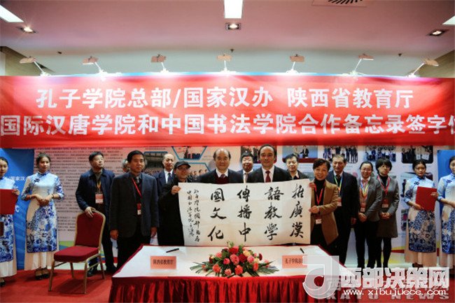 為更好的傳播中國傳統(tǒng)文化、推進教育資源共享,實現與孔子學院內外互補的中國文化交流傳播格局。12日下午,孔子學院總部、國家漢辦、陜西省教育廳舉行了共建中國書法學院和國際漢唐學院的合作備忘錄簽字儀式。備忘錄由孔子學院總部、國家漢辦副總干事趙國成先生和陜西省教育廳副廳長劉建林先生共同簽署。簽字儀式由陜西省教育廳國際交流處副處長文通主持,國家漢辦和陜西省教育廳有關部門的領導以及我校黨委副書記、校長雷亞萍,西北大學副書記、副校長賈明德,中國書法學院院長于唯德,西安工業(yè)大學、西北大學有關部門的領導和師生代表參加了簽字儀式。
