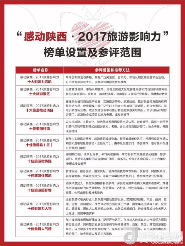 “感動(dòng)陜西·2017旅游影響力”大型評(píng)選活動(dòng),既是對(duì)2017年陜西旅游業(yè)的綜合評(píng)估和優(yōu)勢(shì)品牌項(xiàng)目的一次集中梳理和聯(lián)動(dòng)推廣,評(píng)選活動(dòng)設(shè)置了2017年“十大影響力活動(dòng)”、“十大旅游景區(qū)”、“十大旅游推動(dòng)力項(xiàng)目”、“十佳美麗村鎮(zhèn)”、“十佳旅游縣(區(qū))”、“十佳旅游微傳媒”、“十佳旅游住宿地”、“十佳旅游攝影地”、“十佳影響力人物”、“十佳最具人氣榜”10類項(xiàng)目,采取社會(huì)推薦、自主申報(bào)、專業(yè)推選、游客調(diào)查、網(wǎng)民評(píng)選、社會(huì)公示、大眾點(diǎn)評(píng)、數(shù)據(jù)分析等方法得出評(píng)選結(jié)果,于2018年1月通過(guò)大型盛典對(duì)外公布,使其成為載入史冊(cè)的2017年度陜西旅游業(yè)優(yōu)勢(shì)品牌榜單。