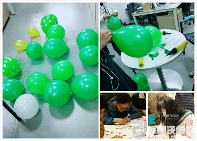 土豆和西紅柿根本就不是一個世界的,但它們走到了一起,變成了薯條和番茄醬它倆就是絕配;學籍制度和競技運動也不是一個世界的,但它們?nèi)诤显诹艘黄?,變成了頭腦風暴和趣味運動它們也可以很般配,現(xiàn)在就讓我們來看看它們是怎么融合的……聽那陣陣氣球爆炸的聲音,他們開始了!在這些綠油油的氣球中有事先設(shè)置的題目隊員們要先擠爆氣球答完題才能得到下一個地方的線索,“補考成績不合格以及成績低于50分必須怎樣?”“本科選修課學分不得低于多少學分?”這些題是不是還要開動腦袋瓜仔仔細細的想想才有答案呢?在比賽的現(xiàn)場一秒都會和對手拉開差距,容不得一絲猶豫拿到線索的隊員們又奔向下一個地點熟悉的教室,這里也不是那么容易通過,看著黑板上的題“冰怎么很快的化成水?”“可替代大學英語四級成績的考試有哪些?”哦,還有計算題,隊員們必須腦洞大開,腦細胞飛速運轉(zhuǎn),做學霸那也是不容易的。只見黑板上粉筆一起一落,答題完畢,看看線索迅速趕往下一地點——地中海。這里指壓板、跳繩早已準備好等著隊員們,學霸不能只管學習身體素質(zhì)也很重要,動起來吧!在指壓板上跳繩,誰想出來的?忍受著腳底的疼痛還要揮動跳繩?太受虐,但是我們是一群不屈不撓的新一代,指壓板上跳繩我們也是鏗鏘有力、一絲不茍。終于結(jié)束痛并快樂著的跳繩環(huán)節(jié),卻看到了整整400塊的拼圖,這個環(huán)節(jié)真是讓人又愛又恨,還記得兒時玩拼圖的快樂,但在這激烈的競爭環(huán)境下,卻是讓人有點心慌和畏懼。隊員們最終齊心協(xié)力戰(zhàn)勝了它,細心、耐心的逐一完好的拼完了每一副圖。