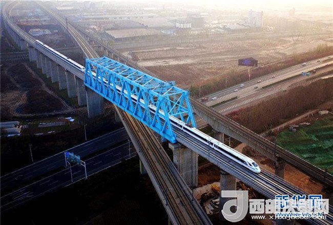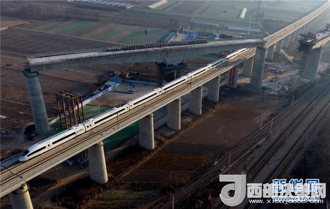 12月19日,一列高鐵從轉體成功后的商合杭高鐵跨鄭徐高鐵T構梁下駛過。商合杭高鐵線路全長794.55公里,設計時速350公里。