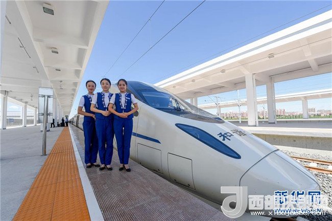 乘務組人員在烏蘭察布站與動車組合影(8月3日攝)。8月3日,內蒙古首列高鐵D6980次列車伴隨著嘹亮的汽笛聲,駛出呼和浩特東火車站,以250公里的時速駛向烏蘭察布站,內蒙古自此正式邁進高鐵時代。