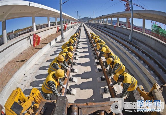 中鐵十九局工程人員在京沈高鐵凌源南站進行鋪軌作業(yè)(9月28日攝)。京沈高鐵起自北京星火站,經(jīng)河北省承德市、遼寧省朝陽市、阜新市接入沈陽站,線路全長698公里,設計時速350公里。