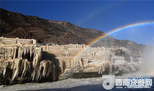 這是12月17日在山西吉縣黃河壺口瀑布拍攝的冰瀑彩虹景觀。當(dāng)日,黃河壺口瀑布出現(xiàn)彩虹景觀。壺口瀑布兩岸姿態(tài)萬(wàn)千的冰瀑,與瀑布上空的彩虹相映成趣,美不勝收。(饒北成 攝)