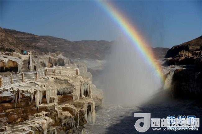 這是12月17日在山西吉縣黃河壺口瀑布拍攝的冰瀑彩虹景觀。當(dāng)日,黃河壺口瀑布出現(xiàn)彩虹景觀。壺口瀑布兩岸姿態(tài)萬(wàn)千的冰瀑,與瀑布上空的彩虹相映成趣,美不勝收。(呂桂明 攝)