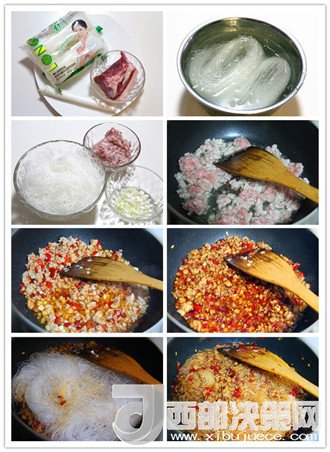 第七步:將粉絲放入鍋內(nèi)翻炒勻均,然后沿著鍋邊倒入小半碗清水。