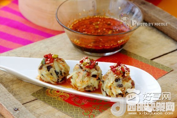 13. 鍋中加入2大勺油、燒熱,倒入辣椒粉中,攪勻,再將油辣子與步驟16中的調料混合,拌勻,吃時蘸食或澆在土豆丸子上即可。