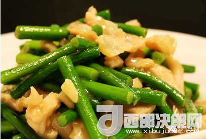 蒜薹300g、板筋肉250g、油、魚露、調味雞汁、生粉、砂糖。