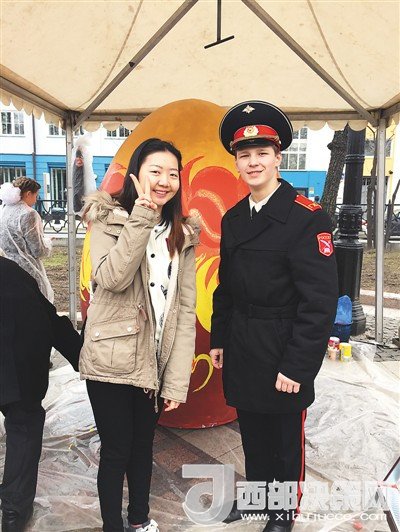 在俄羅斯的節(jié)日慶典活動中,姜若晨(左一)與當?shù)剀娦W生的合影。在她看來,學子與外國朋友的交往過程中要注重自身形象,傳遞中國微笑。
