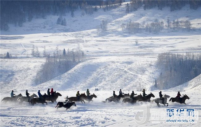 在新疆喀納斯禾木村舉辦的潑雪節(jié)上,當?shù)鼐用裨跒橛慰捅硌萏?月1日攝)。記者 趙戈 攝