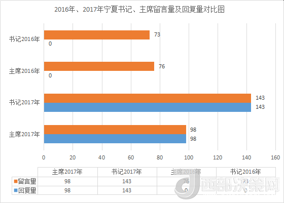 據統(tǒng)計,2017年,人民網網友分別給寧夏黨委書記、政府主席公開留言143條和98條,同期增長幅度較大,其中書記留言量增長49%。值得點贊的是,書記、主席全年的回復率達100%,各項數(shù)據均創(chuàng)新高。