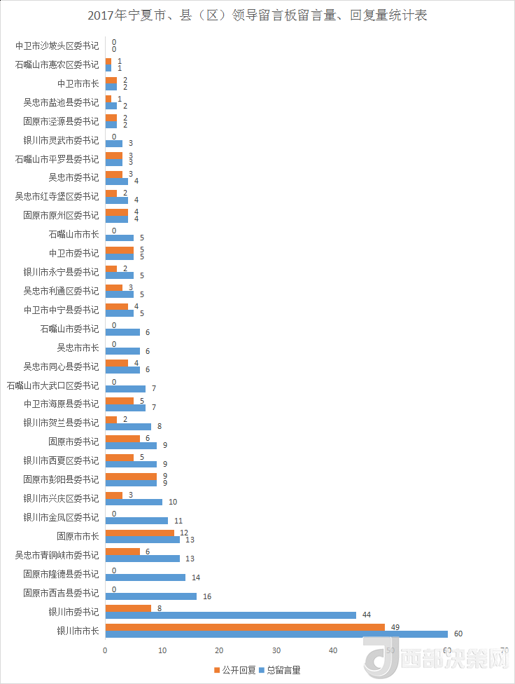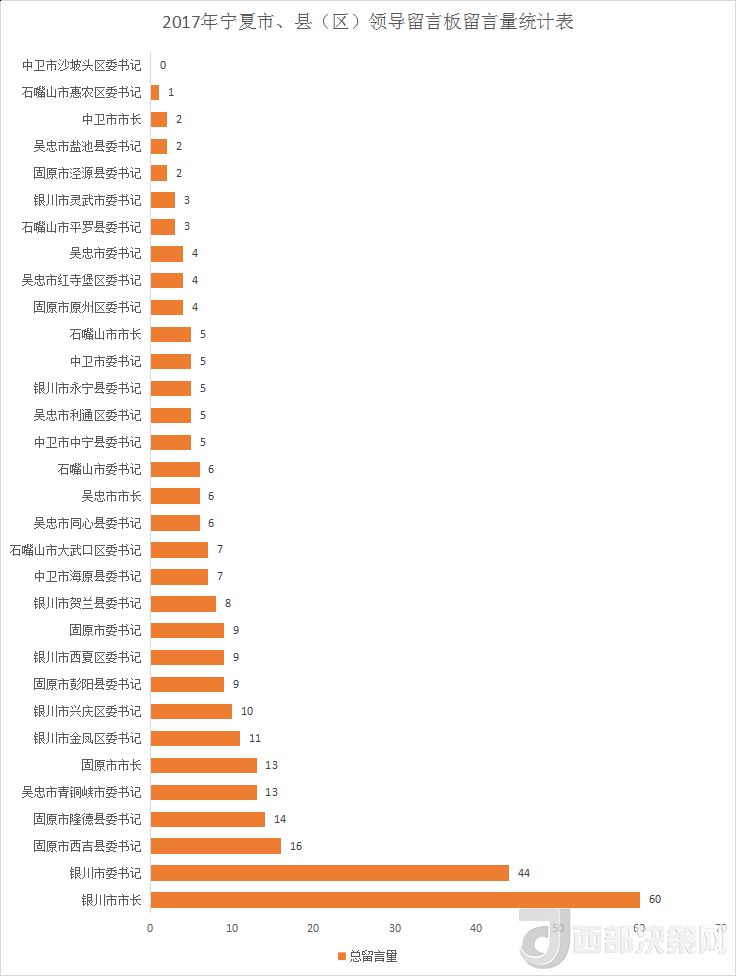 銀川市市長、銀川市委書記、固原市西吉縣委書記的留言量分別以60、44、16條進入前三名。盡管網民給固原市西吉縣委書記的留言量進前三,但回復量卻為0。