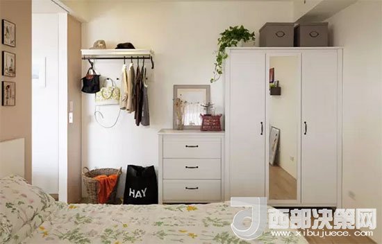藤筐、收納箱、掛衣桿、衣柜,各種收納工具一應俱全,搭配得十分得宜。衣柜中間柜門上安裝了全身鏡。對于不愿把鏡子放進臥室的房友們來說,不知道這樣子布置會不會稍好一些。