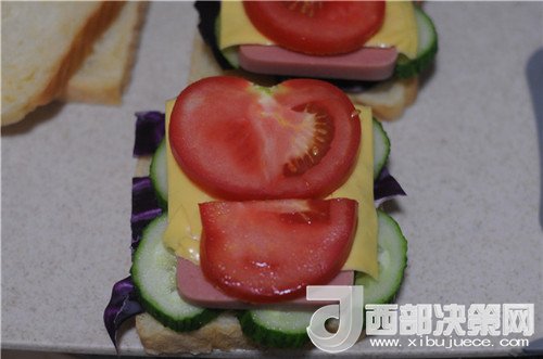 15.再放上芝士片和西紅柿片,蓋上一片土司,用油紙張包裹起來(lái),切開即可