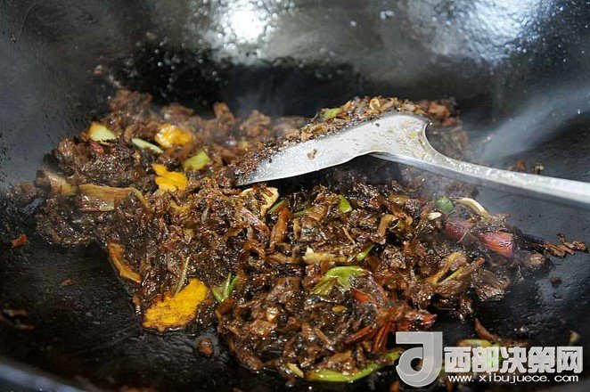 11.加入梅干菜炒出香味后,少放些糖和生抽