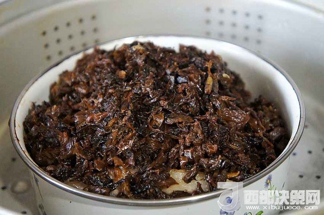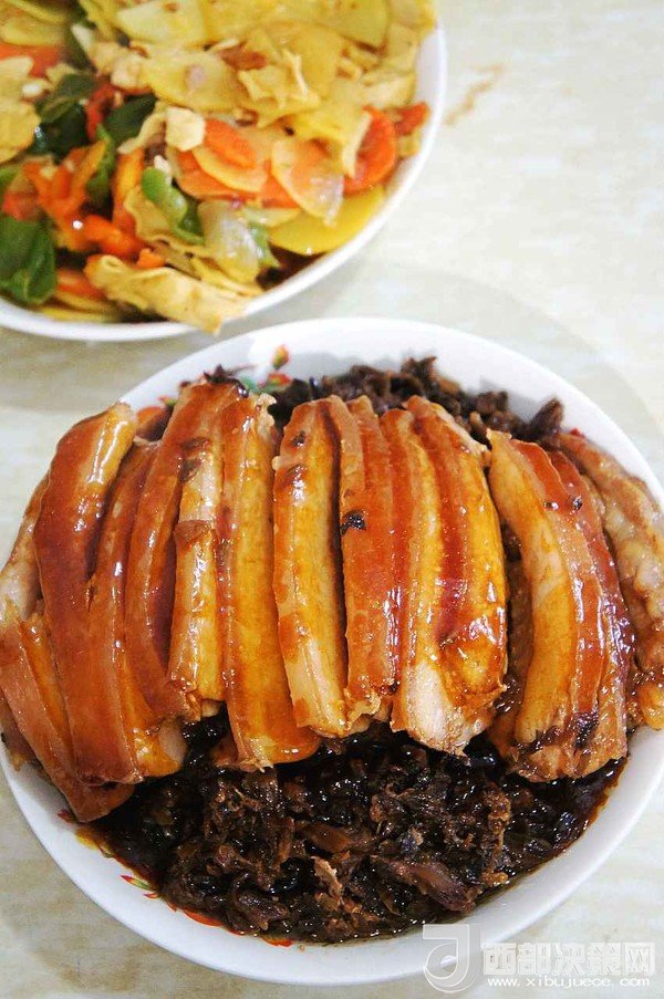 13.把炒好的梅干菜覆蓋在肉上