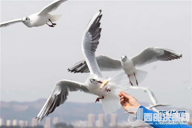 2月21日,紅嘴鷗在昆明市滇池海埂觀景大道上從游人手里啄食。