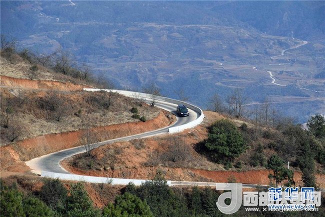 汽車(chē)在尋甸回族彝族自治縣功山鎮(zhèn)一條盤(pán)山公路上行駛(2月19日攝)。