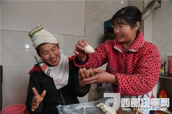 饒梅香(右)帶著代養(yǎng)的孩子德麗艷一起包餃子(2月14日攝)。
