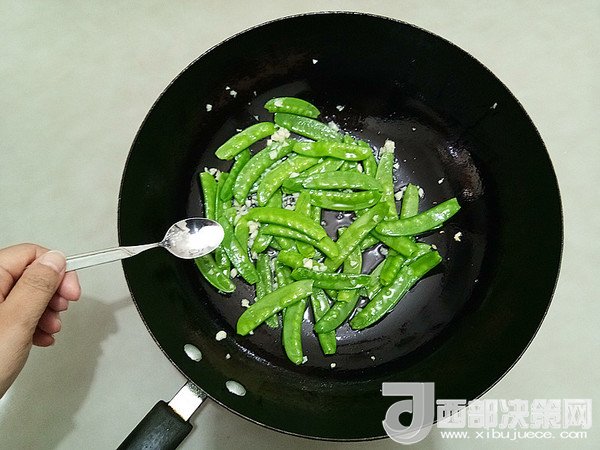 6.爆出香味后放入瀝干水分的荷蘭豆翻炒片刻