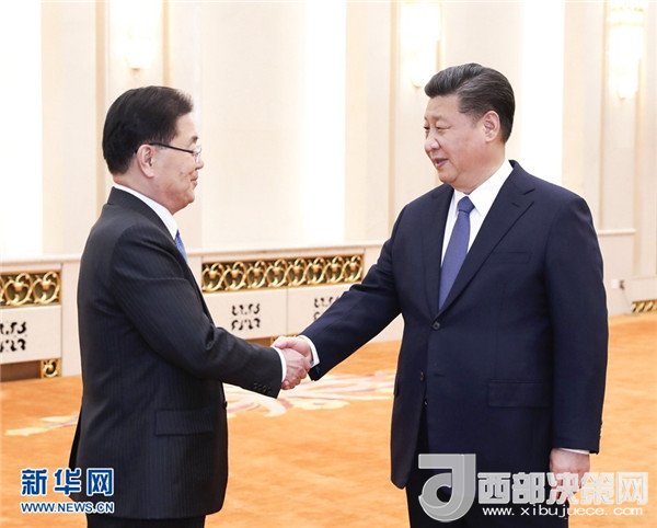 3月12日,國家主席習(xí)近平在北京人民大會堂會見韓國總統(tǒng)特使、國家安保室長鄭義溶。 新華社記者 龐興雷 攝