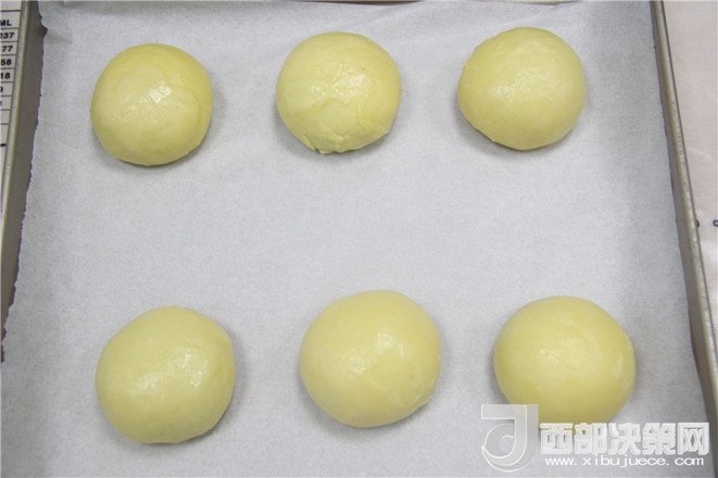 11.把油皮分割成6個(gè)25克,油心分成6個(gè)20克,分別揉成團(tuán)。