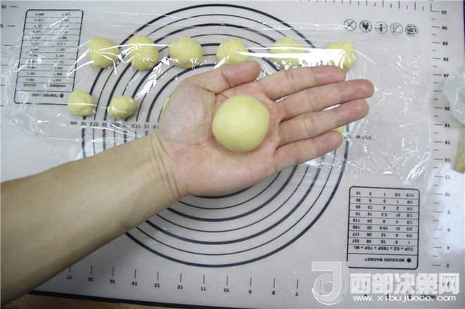 12.把油皮球用掌心均勻的向四周搟開成皮。