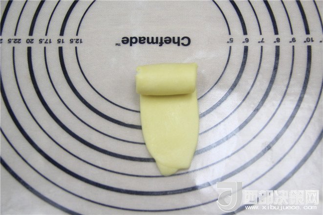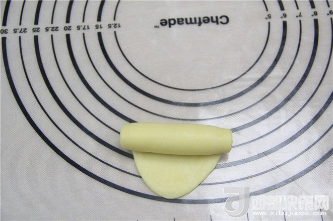19.將搟好的油酥面團(tuán)由上往下卷起。