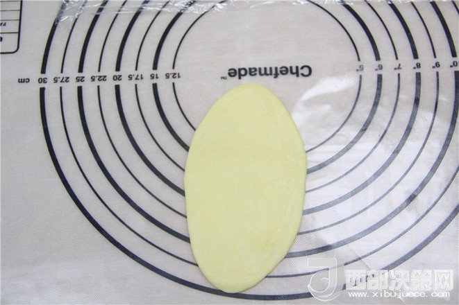 18.油酥面團(tuán)直立放著,然后用搟面杖搟成長條橢圓。