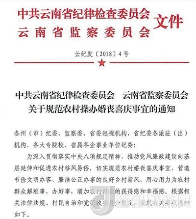 近日,云南省紀(jì)委、監(jiān)察委下發(fā)了《關(guān)于規(guī)范農(nóng)村操辦婚喪喜慶事宜的通知》(下稱《通知》),明確云南省農(nóng)村地區(qū)除為本人及子女操辦婚事,為直系親屬操辦喪事外,一律不操辦客事。