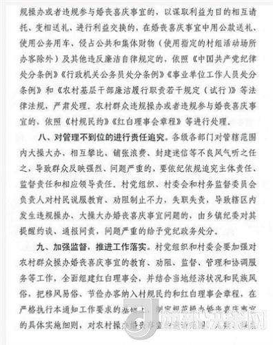 各級(jí)各部門對(duì)管轄范圍內(nèi)大操大辦、相互攀比、鋪張浪費(fèi)、封建迷信等不良風(fēng)氣聽之任之,導(dǎo)致群眾反映強(qiáng)烈、問題嚴(yán)重的,要依紀(jì)依規(guī)追究主體責(zé)任、監(jiān)督責(zé)任和相應(yīng)領(lǐng)導(dǎo)責(zé)任。村黨組織、村委會(huì)和村務(wù)監(jiān)督委員會(huì)負(fù)責(zé)人對(duì)村民說服教育、勸阻制止不力,失職失責(zé),導(dǎo)致轄區(qū)內(nèi)發(fā)生違規(guī)操辦、大操大辦婚喪喜慶事宜問題的,由鄉(xiāng)鎮(zhèn)紀(jì)委對(duì)其提醒約談、通報(bào)問責(zé),問題嚴(yán)重的給予黨紀(jì)政務(wù)處分。