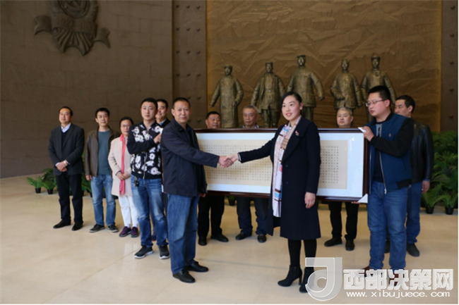 西部決策網(wǎng)——西部大開發(fā)訊(帥華鋒 通訊員 柴金霞 陳彥榮)“三月的南梁,大地處處蕩漾著春的漣漪.....”在這生機(jī)勃勃、春意盎然的美好時節(jié),中國書法家協(xié)會會員、首屆《世界華人運(yùn)動大會書畫展》楷書評委、清心齋主人趙倉老師一行,帶著對革命老區(qū)的深情厚誼和對劉志丹、謝子長、習(xí)仲勛等革命先輩舍生忘死、救民出水火的崇敬之意來到革命圣地——南梁,向紀(jì)念館捐贈書法作品《長恨歌·習(xí)仲勛》。本作品系趙倉老師艱辛創(chuàng)作的佳品力作,飽含了趙倉老師豐厚的文化內(nèi)涵,真實再現(xiàn)了習(xí)仲勛老人不畏艱難、矢志堅守的人生壯麗詩篇。