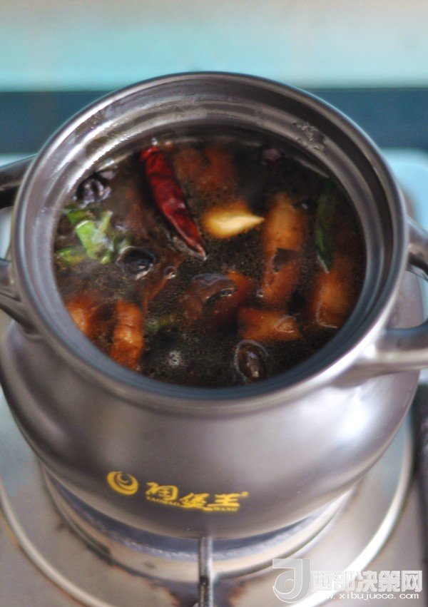 4.將五花肉移入砂鍋中,加滿水,放入干辣椒、香葉,水開后轉(zhuǎn)小火煲煮一個(gè)小時(shí)。