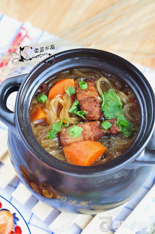 5.五花肉燉軟爛后,加入鹽后,將泡軟的粉絲放入。