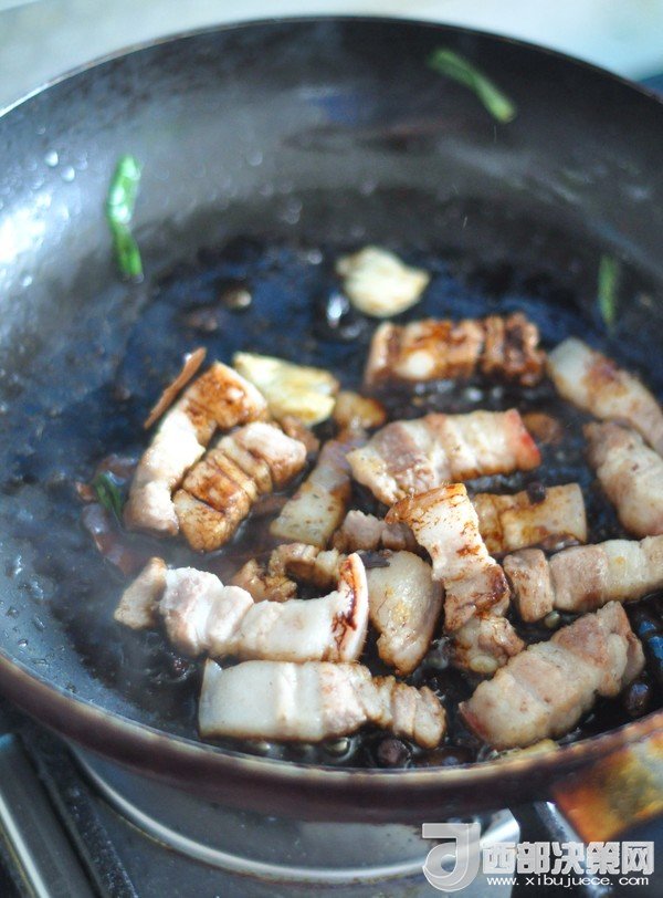 3.鍋里倒少許油,放入五花肉煸炒,加入八角、蔥、姜、蒜,老抽、料酒。