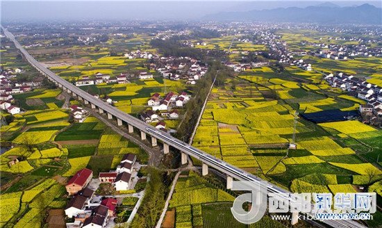 3月21日,一列動(dòng)車(chē)正通過(guò)陜西省漢中市南鄭縣新集鎮(zhèn)油菜花海(無(wú)人機(jī)拍攝)。新華社記者 陶明 攝