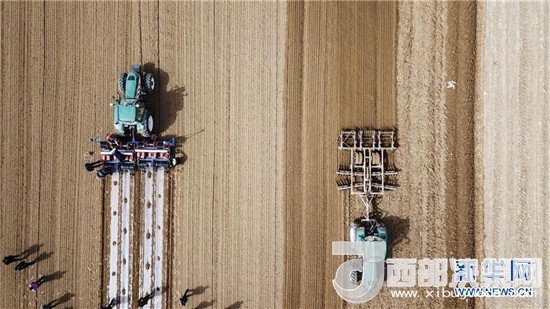 3月23日,“智能拖拉機(jī)”在新疆庫(kù)車(chē)縣牙哈鎮(zhèn)的一處棉田中進(jìn)行精細(xì)化作業(yè)(無(wú)人機(jī)拍攝)。新華社記者 胡虎虎 攝