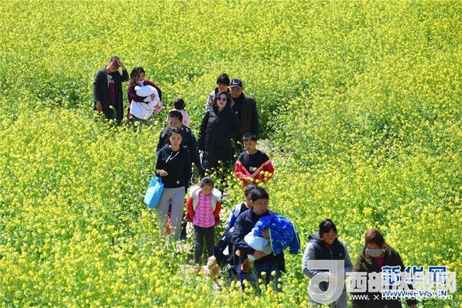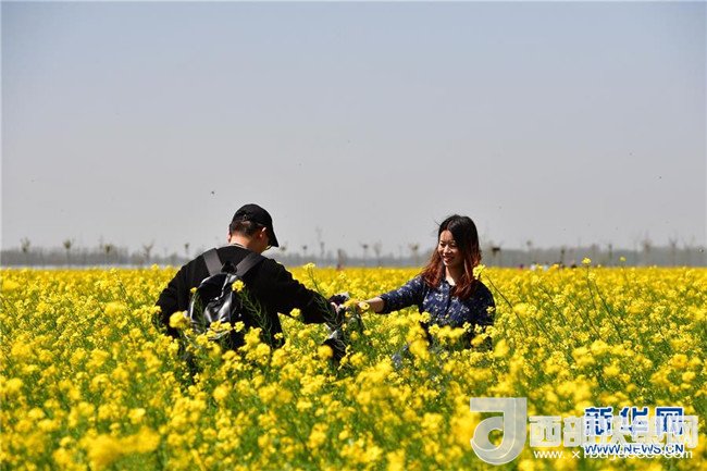 4月7日,游客在河南省封丘縣曹崗鄉(xiāng)的油菜花海中踏青賞花。