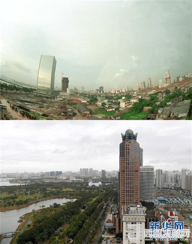 拼版照片為??谑袨I海大道南側的建筑物今昔對比(上圖為1990年1月10日新華社記者姜恩宇攝,下圖為2018年4月15日新華社記者趙穎全攝)。