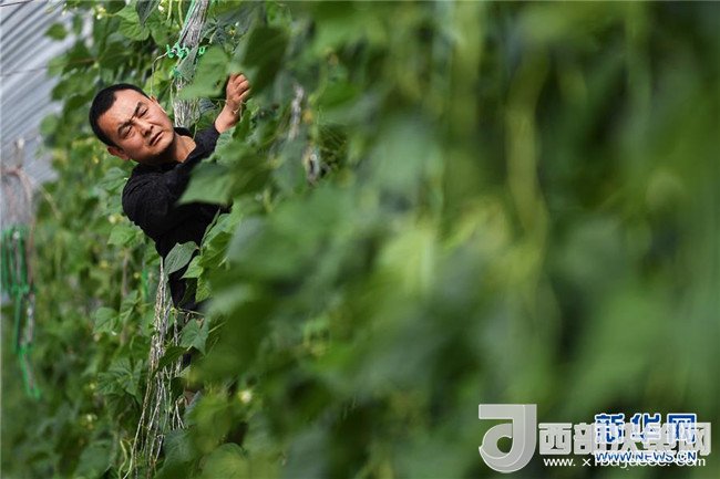 4月18日,甘肅省酒泉市肅州區(qū)總寨鎮(zhèn)總寨村村民范立德在戈壁農(nóng)業(yè)產(chǎn)業(yè)園的日光溫室內勞作。