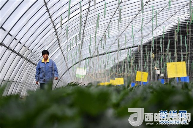 4月18日,甘肅省酒泉市肅州區(qū)總寨鎮(zhèn)總寨村村民范立德在戈壁農(nóng)業(yè)產(chǎn)業(yè)園的日光溫室內查看蔬菜生長情況。