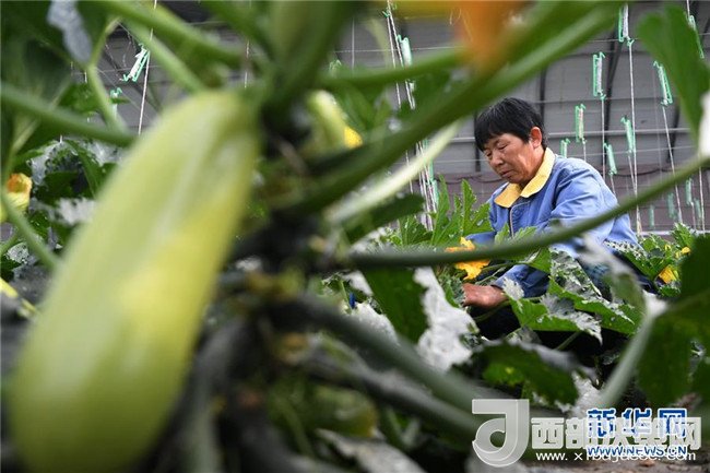 4月18日,一位村民在甘肅省酒泉市肅州區(qū)總寨戈壁農(nóng)業(yè)產(chǎn)業(yè)園的日光溫室內采摘蔬菜。