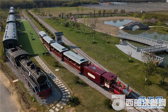 游客乘坐觀光小火車(chē)從浙江省安吉縣魯家村的休閑驛站邊駛過(guò)(3月23日無(wú)人機(jī)拍攝)。