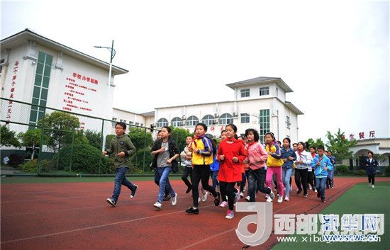 4月25日,陜西省勉縣溫泉鎮(zhèn)中心小學學生在塑膠操場上進行體育課前熱身活動。