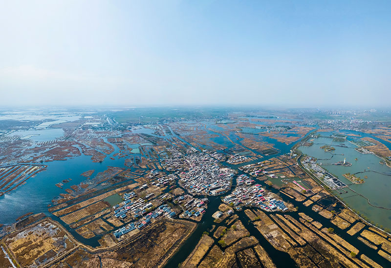 這是白洋淀中的村莊(3月29日無(wú)人機(jī)拍攝)。新華社記者 沈伯韓 攝