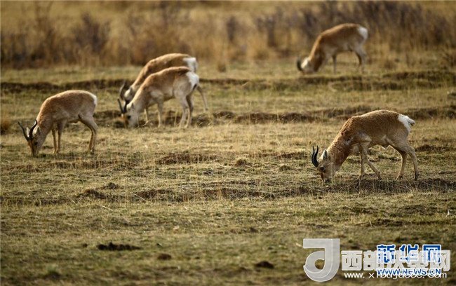 4月26日,一群普氏原羚在青海省海北藏族自治州剛察縣哈爾蓋鎮(zhèn)附近的草原覓食。新華社記者張宏祥攝